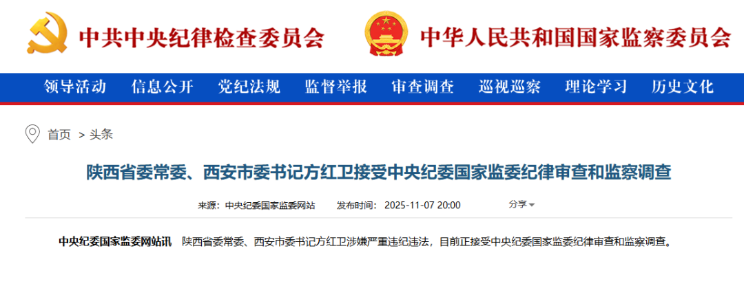 中央纪委国家监委网站11月7日发布消息,陕西省委常委、西安市委书记方红卫涉嫌严重违纪违法,目前正接受中央纪委国家监委纪律审查和监察调查。