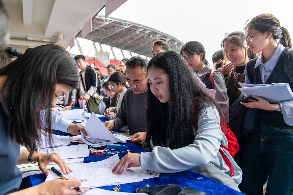 2025年11月8日,位于浙江省金华市的浙江师范大学校园里,大学生在师范类专场招聘会上排队应聘就业岗位。
