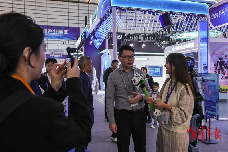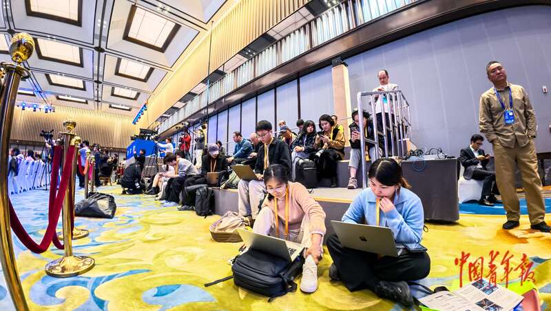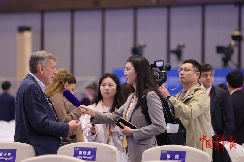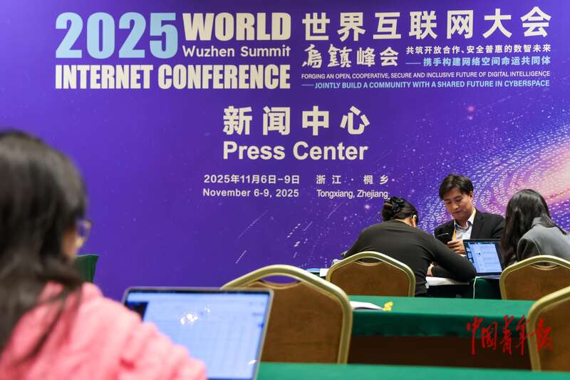 11月8日,浙江乌镇,2025年世界互联网大会“互联网之光”博览会,记者们在现场采访。陈思阳/摄