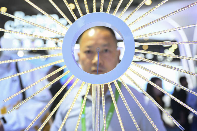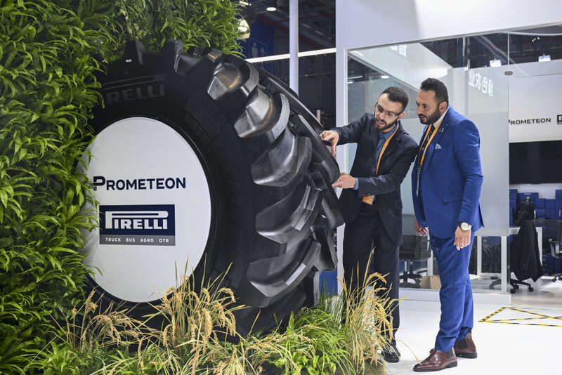11月6日,在进博会汽车及智慧出行展区百得安轮胎集团展台,展商在亚洲首发产品绿色农业轮胎AT02前交流。新华社记者 陈浩明 摄