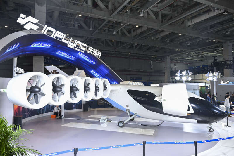 11月6日在进博会汽车及智慧出行展区天翎科展台拍摄的L600全尺寸倾转涵道翼eVTOL。这是该产品全球首发。新华社记者 陈浩明 摄