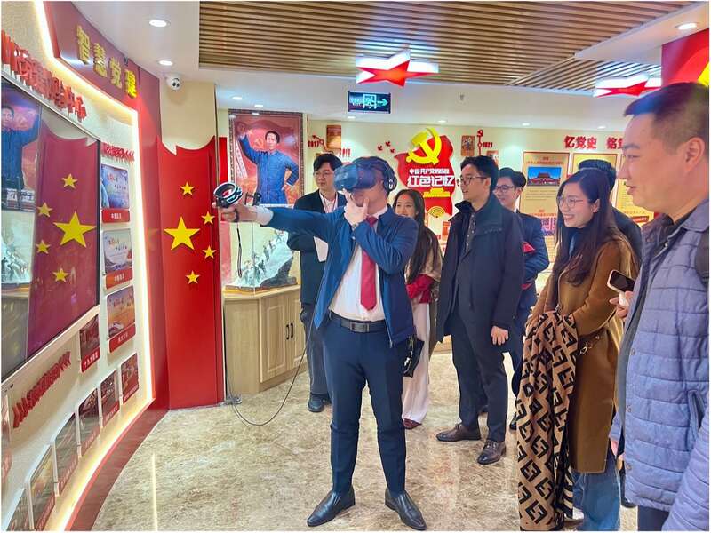 11月7日,陕西西安,越南青年走进中共西安高新区第一楼宇委员会,在VR党建体验中心体验“强渡大渡河”。中青报·中青网记者 赵安琪/摄