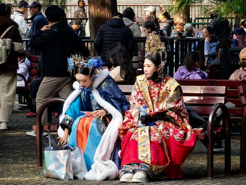 2025年11月8日,北京,天坛公园冬日风光烂漫,游客身着古装“穿越”游天坛公园,欣赏初冬美好时光,展国风国潮服饰魅力,成为一道独特的文旅新风景。