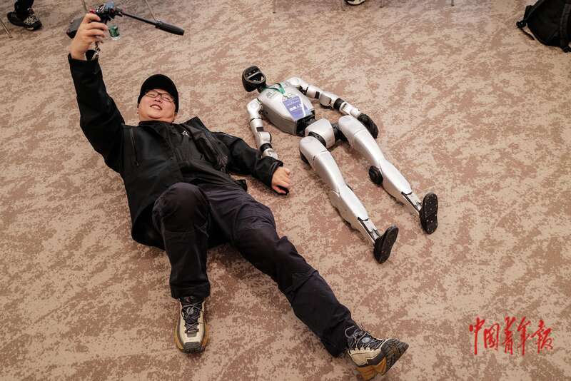 11月9日,北京经济技术开发区(北京亦庄),首届中国(国际)机器人辩论大赛决赛休息间隙,一名男士和参赛机器人合影留念。 中青报·中青网记者 赵迪/摄
