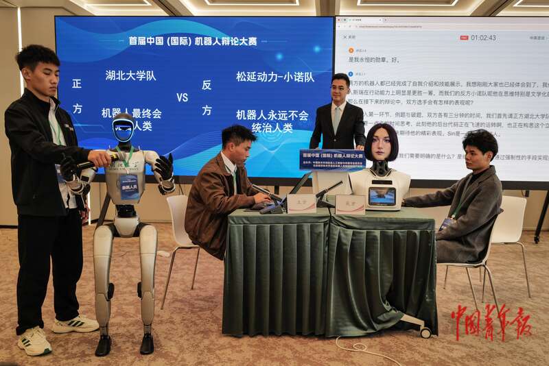 11月9日,北京经济技术开发区(北京亦庄),首届中国(国际)机器人辩论大赛决赛,湖北大学队(左)同松延动力-小诺队围绕“机器人是否会统治人类”这一辩题展开辩论。当天,晋级决赛的湖北大学队、松延动力-松美美队、松延动力-小诺队、河北大学小禾队展开交锋,最终松延动力-小诺队获得冠军。中青报·中青网记者 赵迪/摄