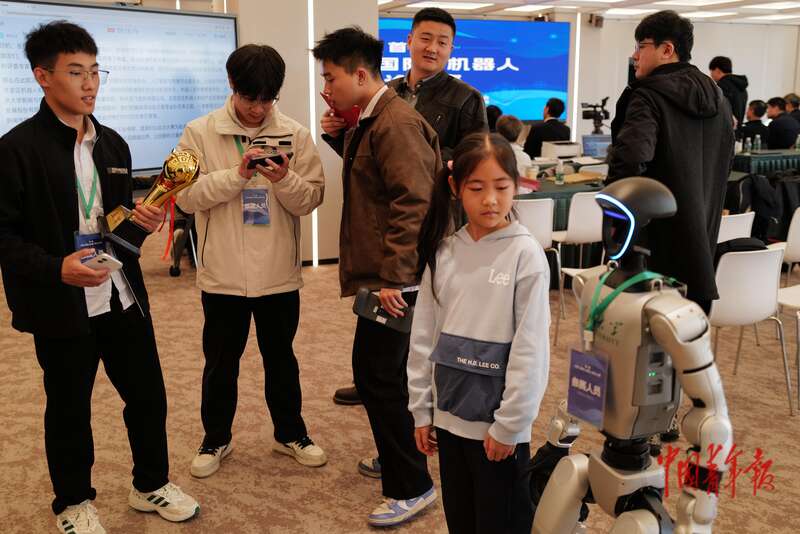 11月9日,北京经济技术开发区(北京亦庄),首届中国(国际)机器人辩论大赛决赛后,获奖选手在相互交流。 中青报·中青网记者 赵迪/摄