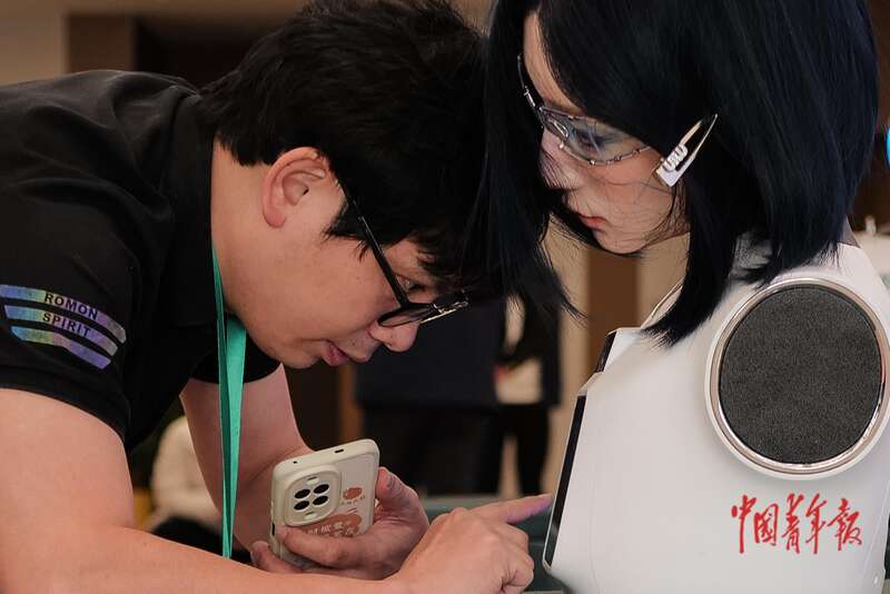 11月9日,北京经济技术开发区(北京亦庄),首届中国(国际)机器人辩论大赛决赛机器人才艺展示环节,现场嘉宾拿起手机,体验机器人模拟人类脸部动作的功能。 中青报·中青网记者 赵迪/摄