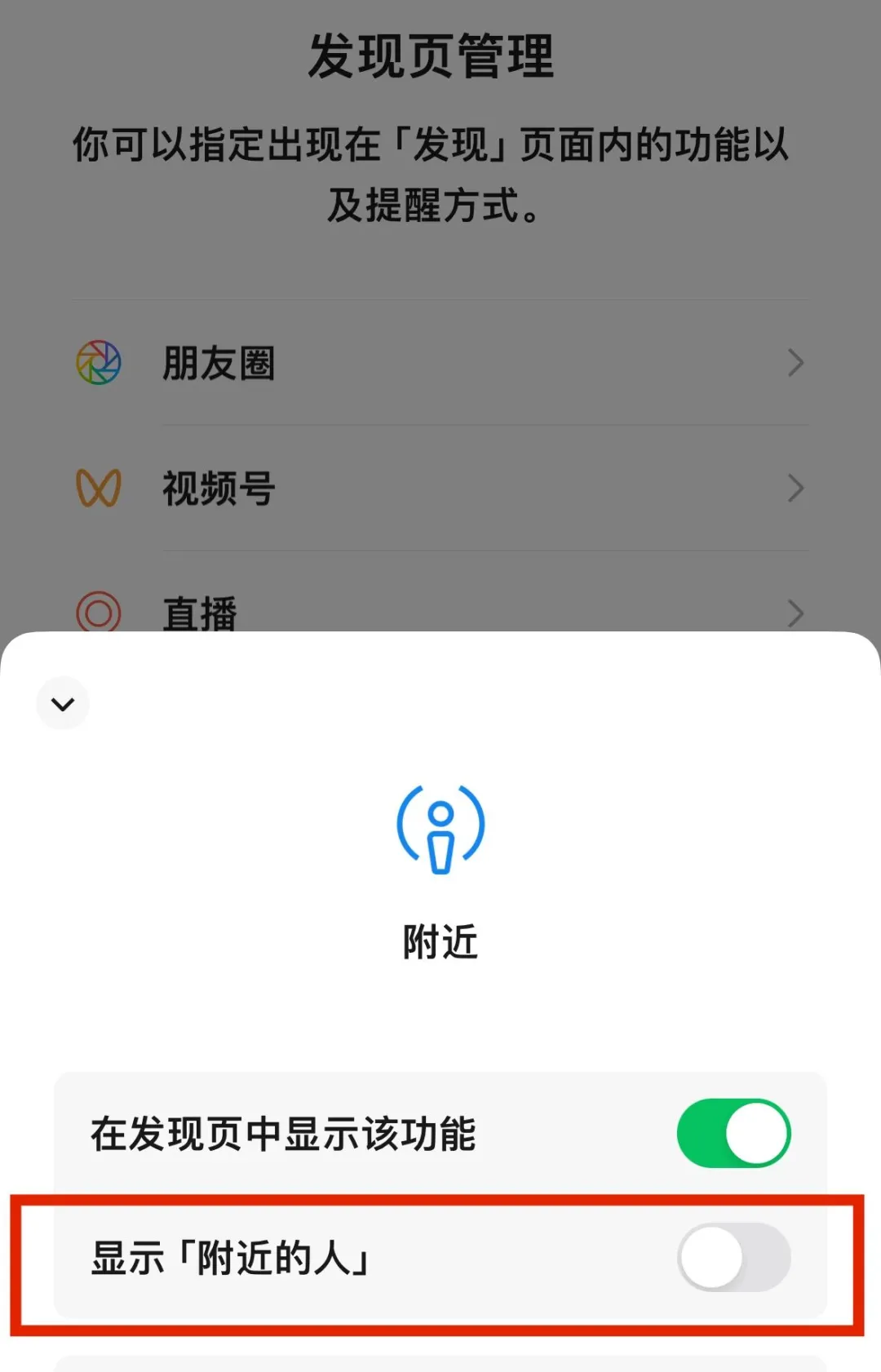 微信【设置】→【通用】→【发现页管理】→【附近】关闭该功能。
