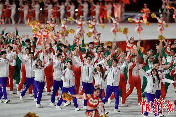 This year's National Games is jointly hosted by Guangdong, Hong Kong and Macao. During the entrance ceremony, the sports delegations from Guangdong, Hong Kong, and Macao marched into the stadium together. Their joint entrance, walking side-by-side, became one of the most moving scenes of the entire opening ceremony.(Photo by Li Junhui/China Youth Daily)
