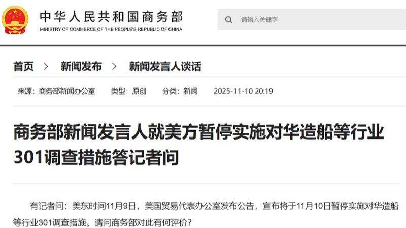 商务部新闻发言人就美方暂停实施对华造船等行业301调查措施答记者问