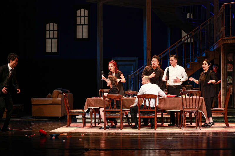 舞台中央,一座三层美式木质小楼以透视图般的方式展开在观众眼前。舞美设计申奥采用立体写意的笔触,既保留了一层客厅、餐厅的真实生活场景,又通过二三层木构线条的勾勒,拓展出丰富的视觉层次。随着转台缓缓转动,这座象征着家庭羁绊的建筑每个角落都成为表演区域,与剧中“牢笼”的核心意象紧密呼应。