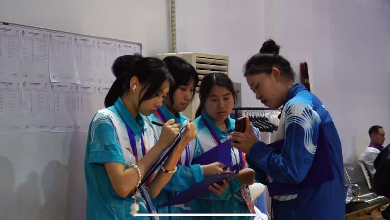 武术套路比赛现场,志愿者用标准的抱拳礼问候武术运动员,中国传统文化礼仪闪耀场上场下。