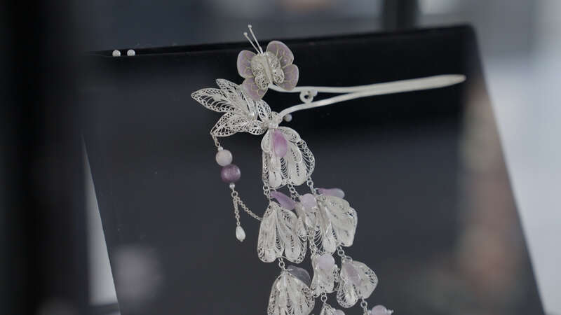 同班的加米娜·吐尔洪江,则对展览中的刺绣作品《凤穿牡丹》情有独钟。这幅由上海工艺美院刺绣大师工作室张丹奕创作的作品,以“百鸟之王”凤凰与“百花之王”牡丹为灵感,用细腻针法勾勒出七彩绚烂的“凤穿牡丹”奇景。