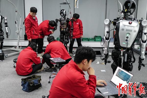 11月10日,北京人形机器人数据训练中心,几名负责机器人维修工作的年轻人正在交流。