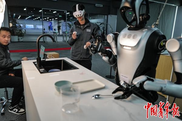 10月29日,北京人形机器人数据训练中心厨房场景区,来自唐山海运职业学院大数据技术专业的大三学生刘洋(中)和来自山东建筑大学土木工程专业的许厚权(左)在训练机器人抓取餐具。在这里目前启动的6000多平方米的空间内,一台台人形机器人在训练师的指导下,模仿着人类在工业智造、智慧家庭、康养服务和5G融合四大类共16个细分场景中的基础行为动作,为人形机器人实现智能化提供更多数据支撑。不少刚刚踏入社会的年轻人或在校大学生在此工作。