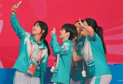 广州体育学院亚运篮球馆,志愿者在结束工作后自拍留念。本报记者 马国英摄