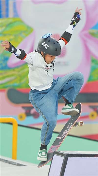 参赛选手在滑板项目女子街式赛比赛中。新华社记者 刘 坤摄