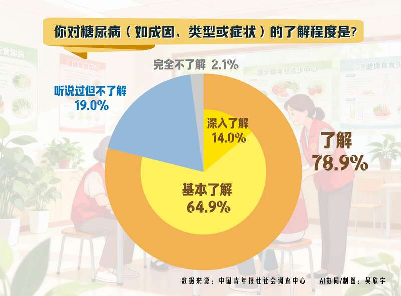 本周,中国青年报社社会调查中心联合问卷网(wenjuan.com),对1334名受访者进行的一项调查显示,78.9%的受访者认为自己了解糖尿病(如成因、类型或症状),84.3%的受访者认为患糖尿病是含糖饮料摄入过多(如奶茶、碳酸饮料)导致的,意识到有遗传或其他因素的受访者不足五成。