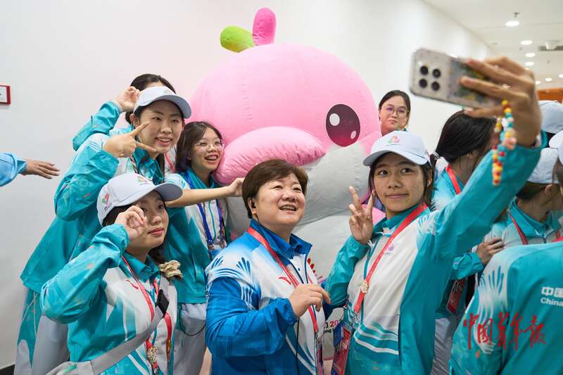 11月14日,广东深圳,宝安体育中心体育馆,当日十五运会拳击比赛后,全运会志愿者“小海豚”们与本届全运会吉祥物“乐融融”合影留念。据了解,保障本届全运会拳击赛事的200名“小海豚”志愿者来自深圳职业技术大学,平均年龄仅18.5岁。从赛事信息传递到设备保障,从观众引导到运动员服务,他们的身影活跃在赛场的各个角落,成为赛事运行中不可或缺的力量。中青报·中青网记者 田嘉硕/摄