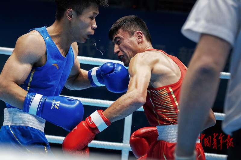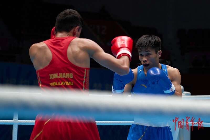 11月14日,广东深圳,宝安体育中心体育馆,十五运会拳击男子60-63.5公斤级决赛,广东队朱健豪(左)与新疆队伊卜拉伊木·马木提在比赛中展开对攻。中青报·中青网记者 田嘉硕/摄
