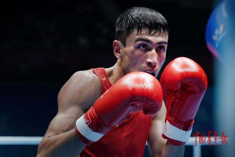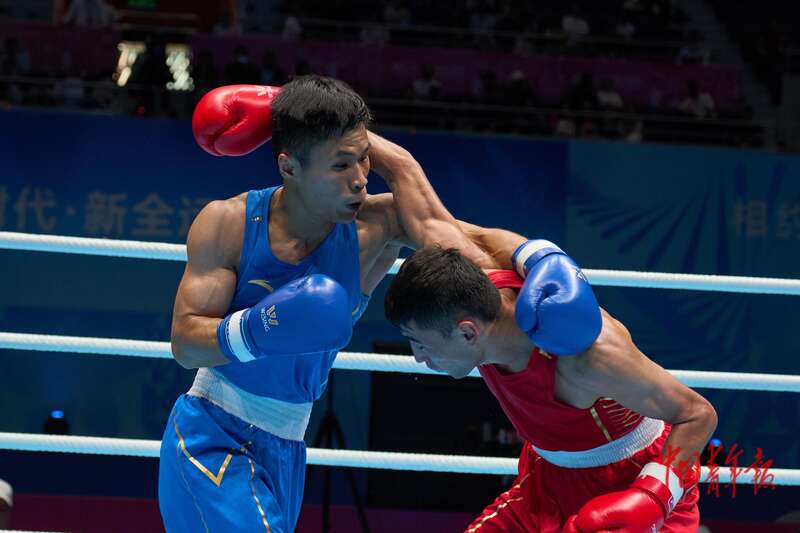 11月14日,广东深圳,宝安体育中心体育馆,十五运会拳击男子60-63.5公斤级决赛,新疆队伊卜拉伊木·马木提在比赛中。中青报·中青网记者 田嘉硕/摄