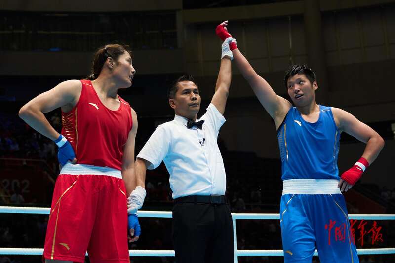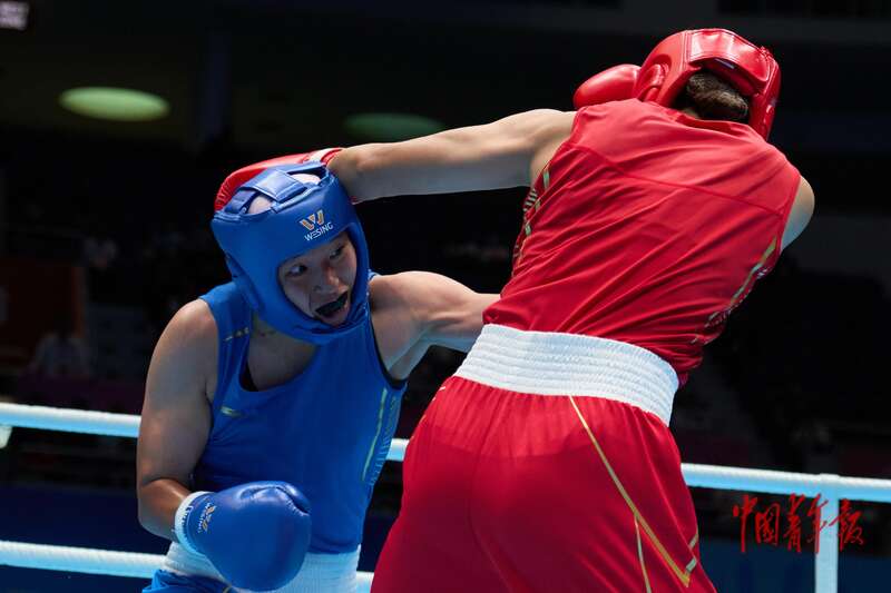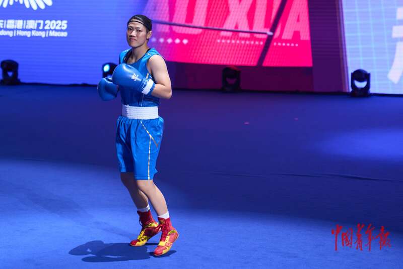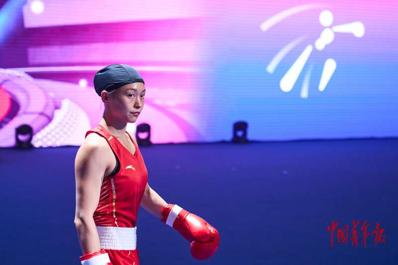 11月14日,广东深圳,宝安体育中心体育馆,十五运会拳击女子52-54公斤级决赛,内蒙古队赵轩出场。中青报·中青网记者 田嘉硕/摄