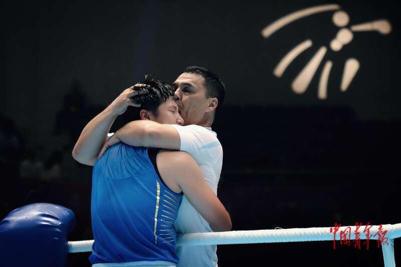 11月14日,广东深圳,宝安体育中心体育馆,十五运会拳击女子70-75公斤级决赛后,浙江队叶金(左)与自己的师父深情拥抱。在接受记者采访时,她笑着说:“今天也是我师父的生日,这是我送给他最好的礼物。”中青报·中青网记者 田嘉硕/摄