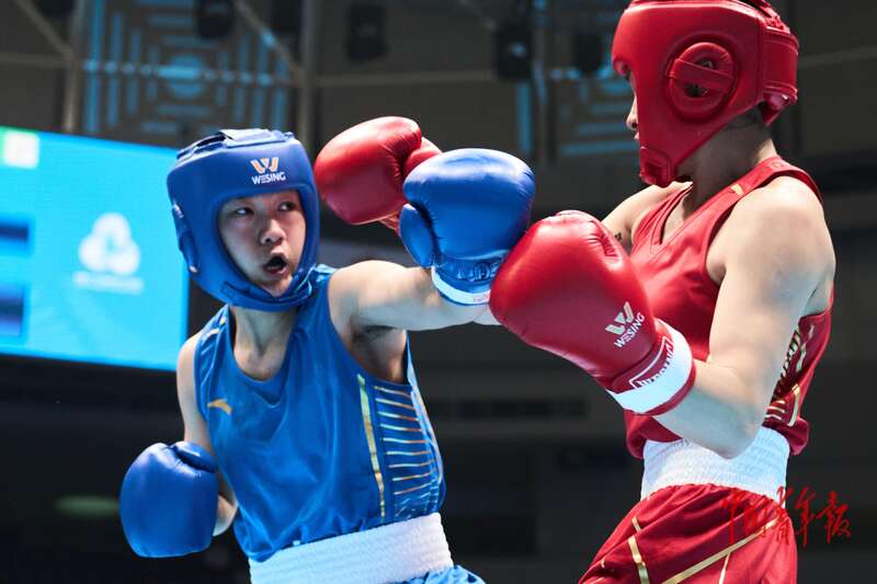 11月14日,广东深圳,宝安体育中心体育馆,十五运会拳击女子52-54公斤级决赛,内蒙古队赵轩(左)挥拳进攻。这场比赛,她以5:0战胜巴黎奥运会冠军得主常园,获得冠军。当日,十五运会拳击比赛迎来最后一个比赛日,在决出最后4枚金牌后圆满收官。中青报·中青网记者 田嘉硕/摄