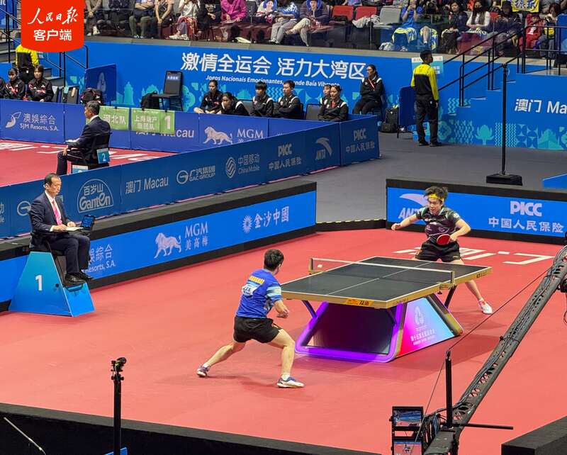 11月15日,十五运会乒乓球项目在澳门银河综艺馆展开两场男单半决赛争夺。刚刚,上海队选手樊振东以4∶2战胜北京队选手王楚钦,晋级男单决赛。他在决赛中的对手将是辽宁队选手袁励岑和海南队选手林诗栋之间的胜者。