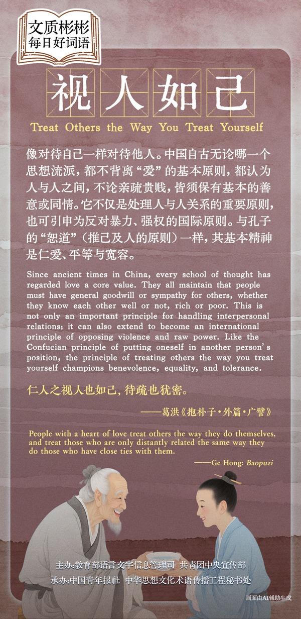 像对待自己一样对待他人。中国自古无论哪一个思想流派,都不背离“爱”的基本原则,都认为人与人之间,不论亲疏贵贱,皆须保有基本的善意或同情。它不仅是处理人与人关系的重要原则,也可引申为反对暴力、强权的国际原则。与孔子的“恕道”(推己及人的原则)一样,其基本精神是仁爱、平等与宽容。