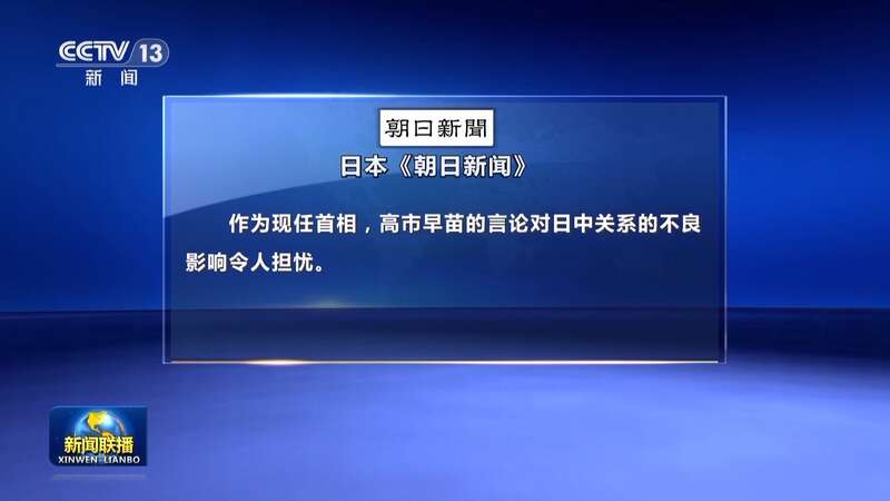 日本《朝日新闻》指出,作为现任首相,高市早苗的言论对日中关系的不良影响令人担忧。