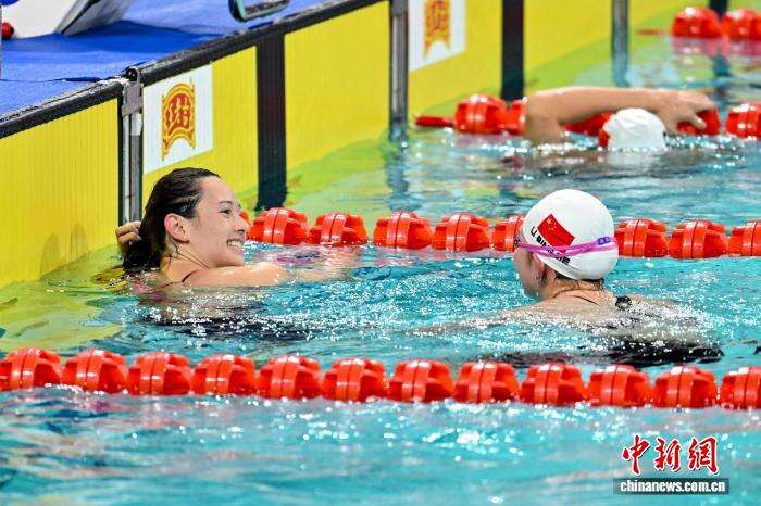 11月13日晚,第十五届全国运动会女子200米自由泳决赛在深圳大运中心游泳馆开赛,香港选手何诗蓓夺得冠军。图为何诗蓓(左)与李冰洁交流。中新社记者韦亮摄