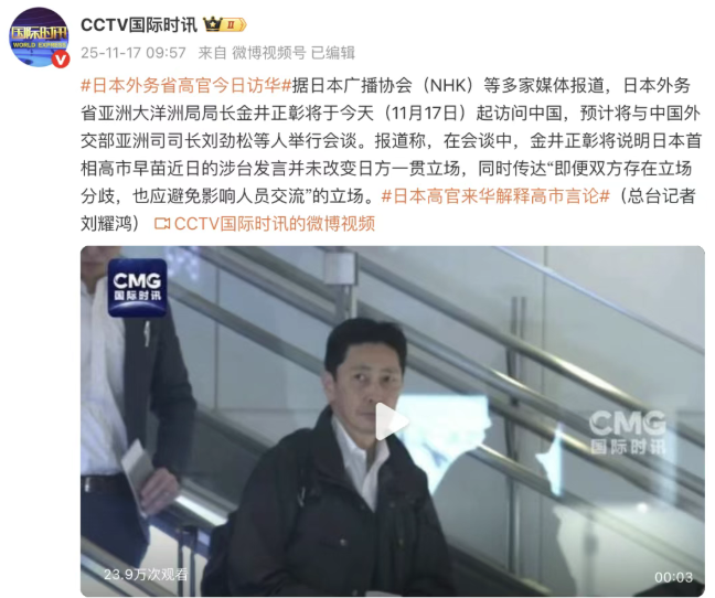据@CCTV国际时讯 援引日本广播协会(NHK)报道,日本外务省亚洲大洋洲局局长金井正彰将于今天(11月17日)起访问中国,预计将与中国外交部亚洲司司长刘劲松等人举行会谈。