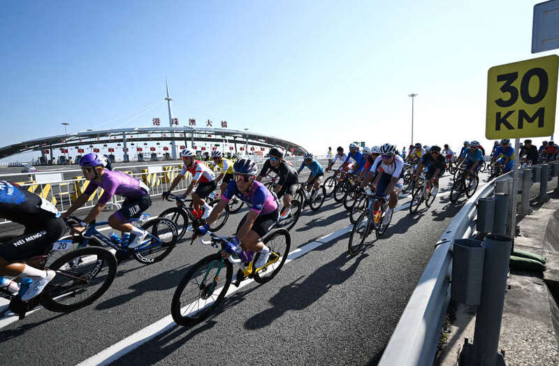 11月8日,在第十五届全国运动会公路自行车男子个人赛决赛中,参赛选手在港珠澳大桥骑行。新华社记者 梁旭 摄