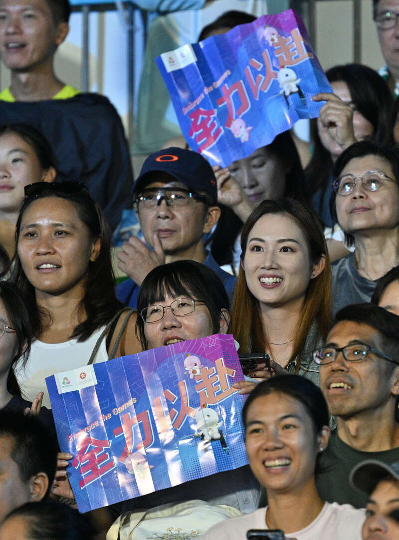 11月8日,在香港进行的第十五届全国运动会沙滩排球女子决赛中,观众为参赛运动员加油。新华社记者 陈铎 摄