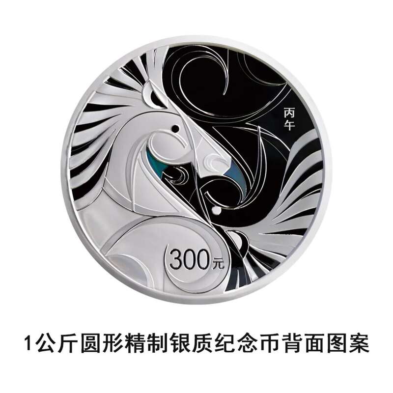 1公斤圆形银质纪念币背面图案为装饰双马造型,并刊“丙午”字样及面额。