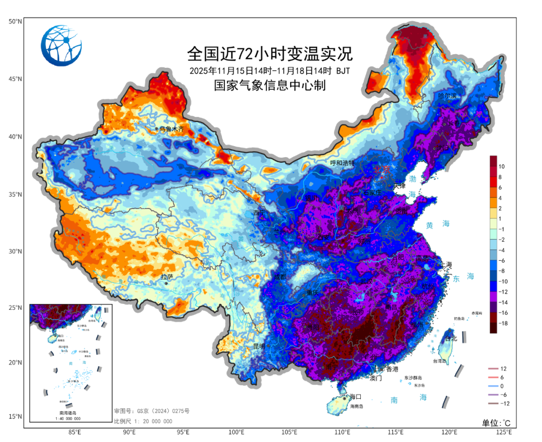 今天,寒潮继续南下,南北气温走势分化。降温最剧烈的区域集中在江南南部到华南一带,最高气温普遍下跌10℃至18℃,降温过后,最高气温超过20℃的地方所剩无几,骤然变冷。