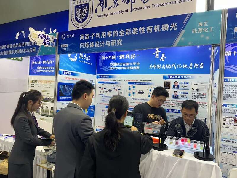第十九届“挑战杯”全国大学生课外学术科技作品竞赛中《高激子利用率的全彩柔性有机磷光闪烁体设计与研究》项目获得全国一等奖(右2为陶冶)。南京邮电大学供图