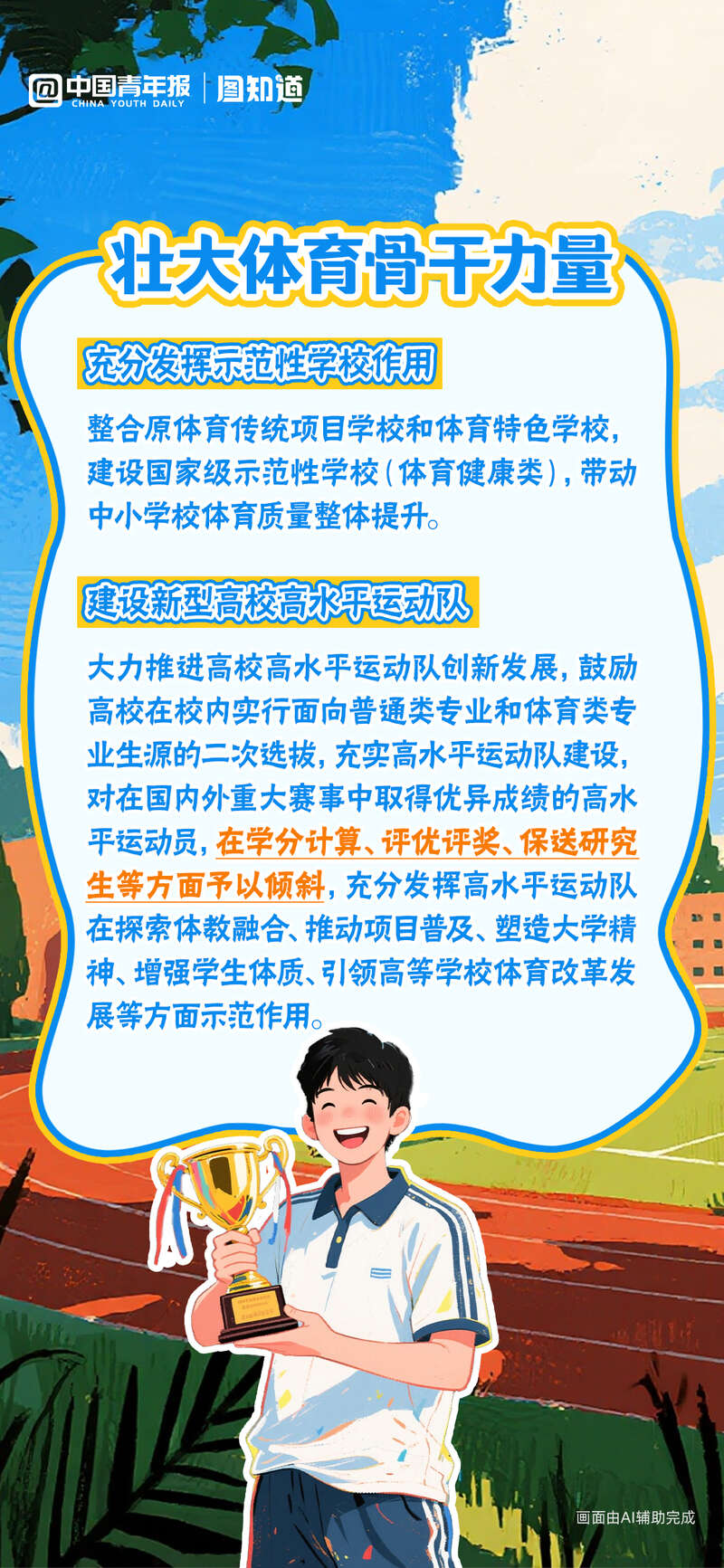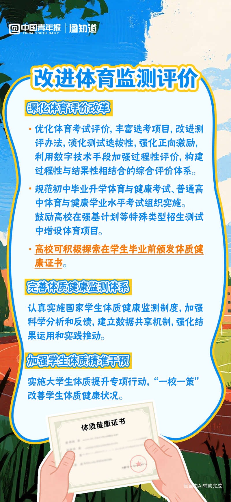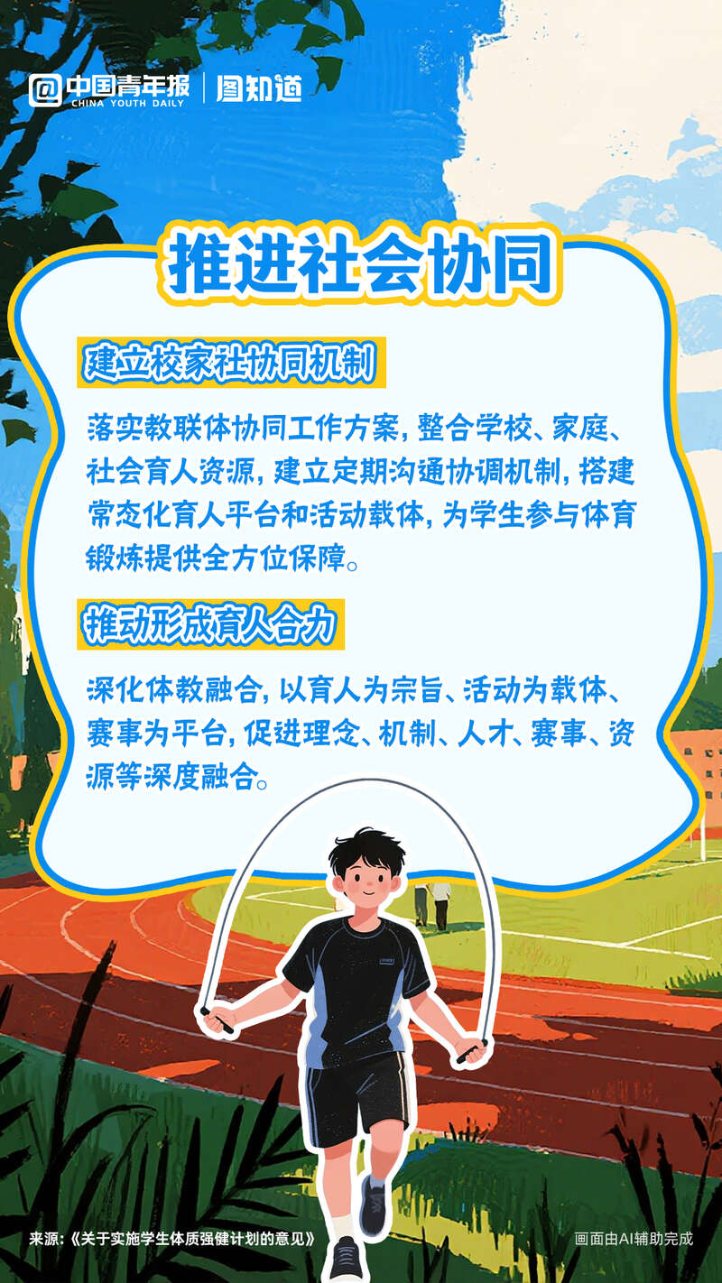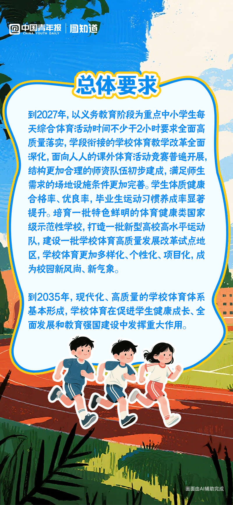 中小学生每天综合体育活动时间不低于2小时,高校可探索在学生毕业前颁发体质健康证书……近日,教育部、国家发展改革委、财政部、人力资源社会保障部、体育总局等五部门联合印发了《关于实施学生体质强健计划的意见》,提出八个方面重点任务。读图划重点。