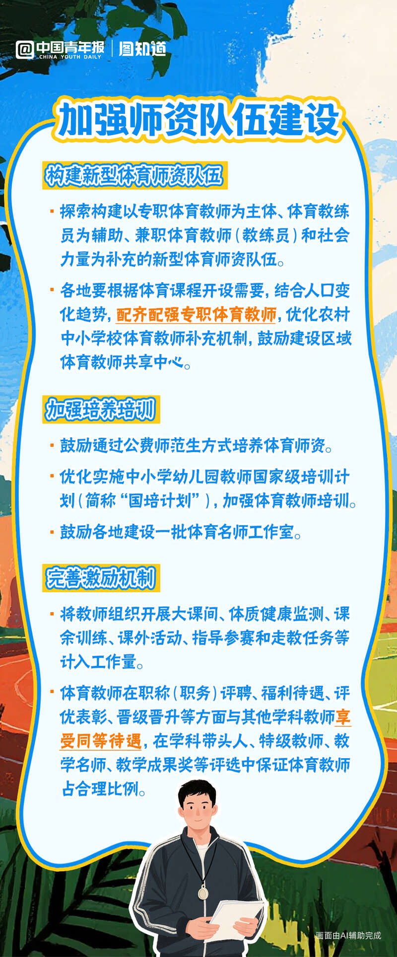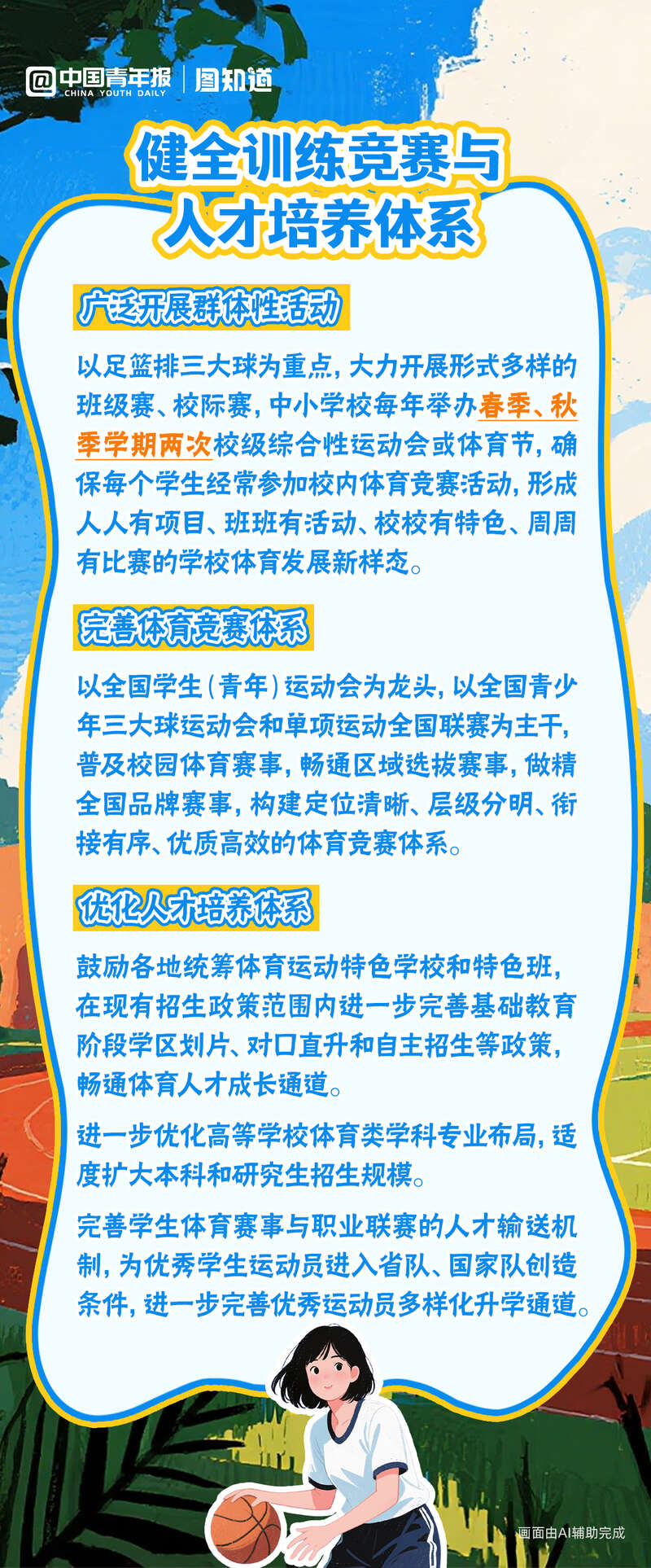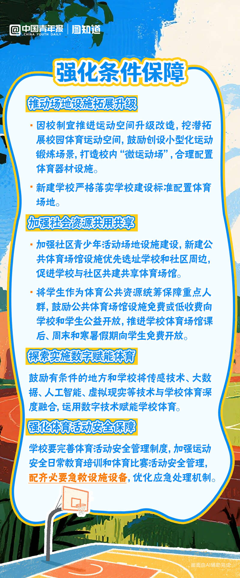 中小学生每天综合体育活动时间不低于2小时,高校可探索在学生毕业前颁发体质健康证书……近日,教育部、国家发展改革委、财政部、人力资源社会保障部、体育总局等五部门联合印发了《关于实施学生体质强健计划的意见》,提出八个方面重点任务。读图划重点。