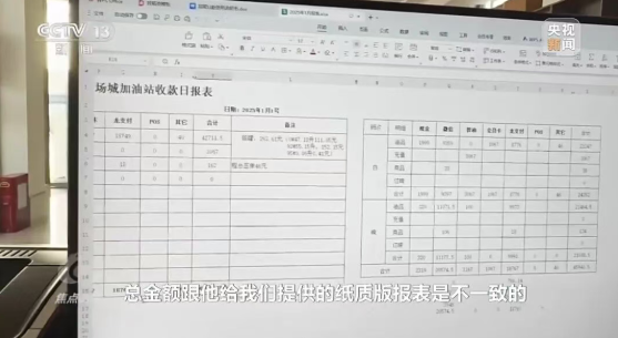 这家加油站交给执法检查人员的纸质账目报表显示,每天营业额只有一两万元,每个月几十万元。而检查人员发现的U盘里是加油站自己记的另一份账,两份账目数字差异很大。在U盘账目记录里,记者看到最近三个月加油站的月销售额数字。