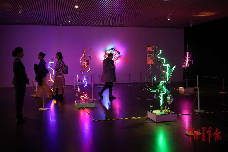 11月22日,北京清华大学艺术博物馆,参观者们穿梭在艺术家袁松的系列作品《风景》中。作者将日常生活中的常见物组合在一起,呈现出奇特的关系以及眼花缭乱的视觉景观,讨论在消费主义背景下的现实与虚幻。中青报·中青网记者 孔斯琪/摄