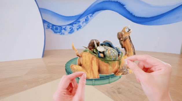 “像这个唐三彩载物卧驼俑,制作惟妙惟肖,能够让观众了解古丝绸之路商贸情况。唐三彩载物卧驼俑放在展柜里,背面部分观众不易看到。现在通过MR(混合现实)眼镜,观众就可以全方位查看这件文物的各处细节。”西安博物院数字与信息部工作人员李源介绍道。