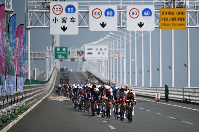 11月8日,参加第十五届全国运动会公路自行车男子个人赛的选手在港珠澳大桥上骑行。新华社记者 邓华 摄