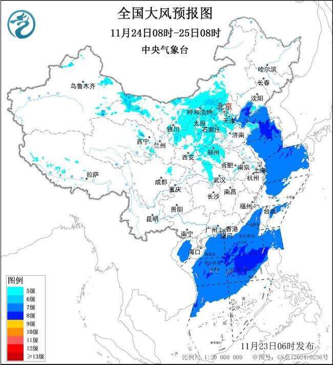 11月24日08时至25日08时,内蒙古中西部、甘肃北部、青海东北部、西北地区东部、华北等地的部分地区有5~7级大风,阵风8~9级,黄淮北部和西部、江汉等地的部分地区有5~6级大风,局部地区阵风7~8级;渤海、黄海中部和南部局地、南海北部和中部海域将有7~8级、阵风9~10级的大风。