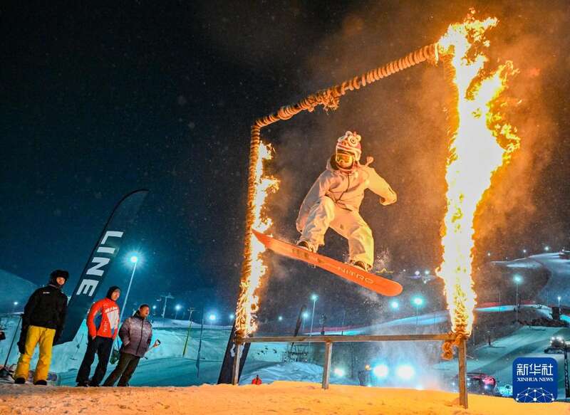 2025年1月29日,在坐落于阿勒泰市城区的新疆将军山国际滑雪度假区,雪友在新春趣味滑雪公园跳台活动中钻过火圈。新华社记者陈朔摄