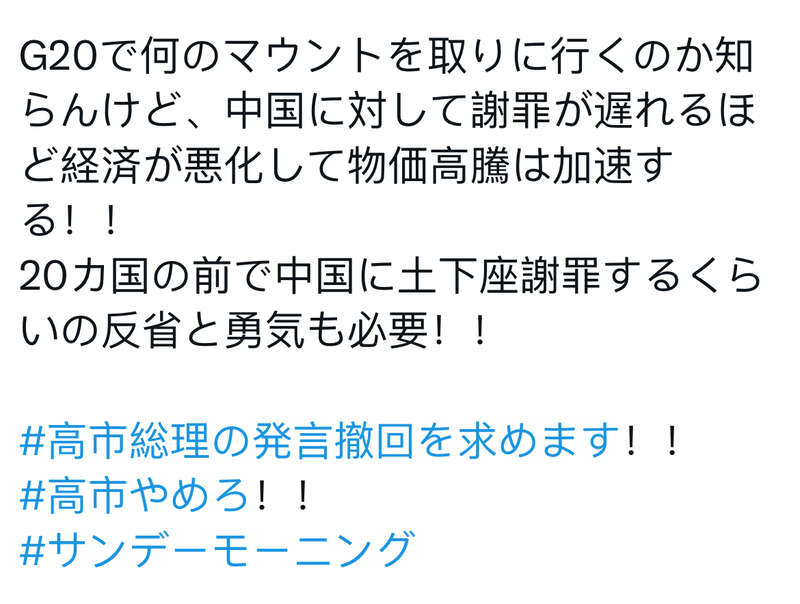 另一名网友在帖文中表示:“我不知道他们在G20峰会上想表达什么,但他们拖延向中国道歉的时间越长,经济状况就会越糟糕,物价也会上涨得越厉害!需要有在20个国家面前跪下向中国道歉的悔意和勇气!!”