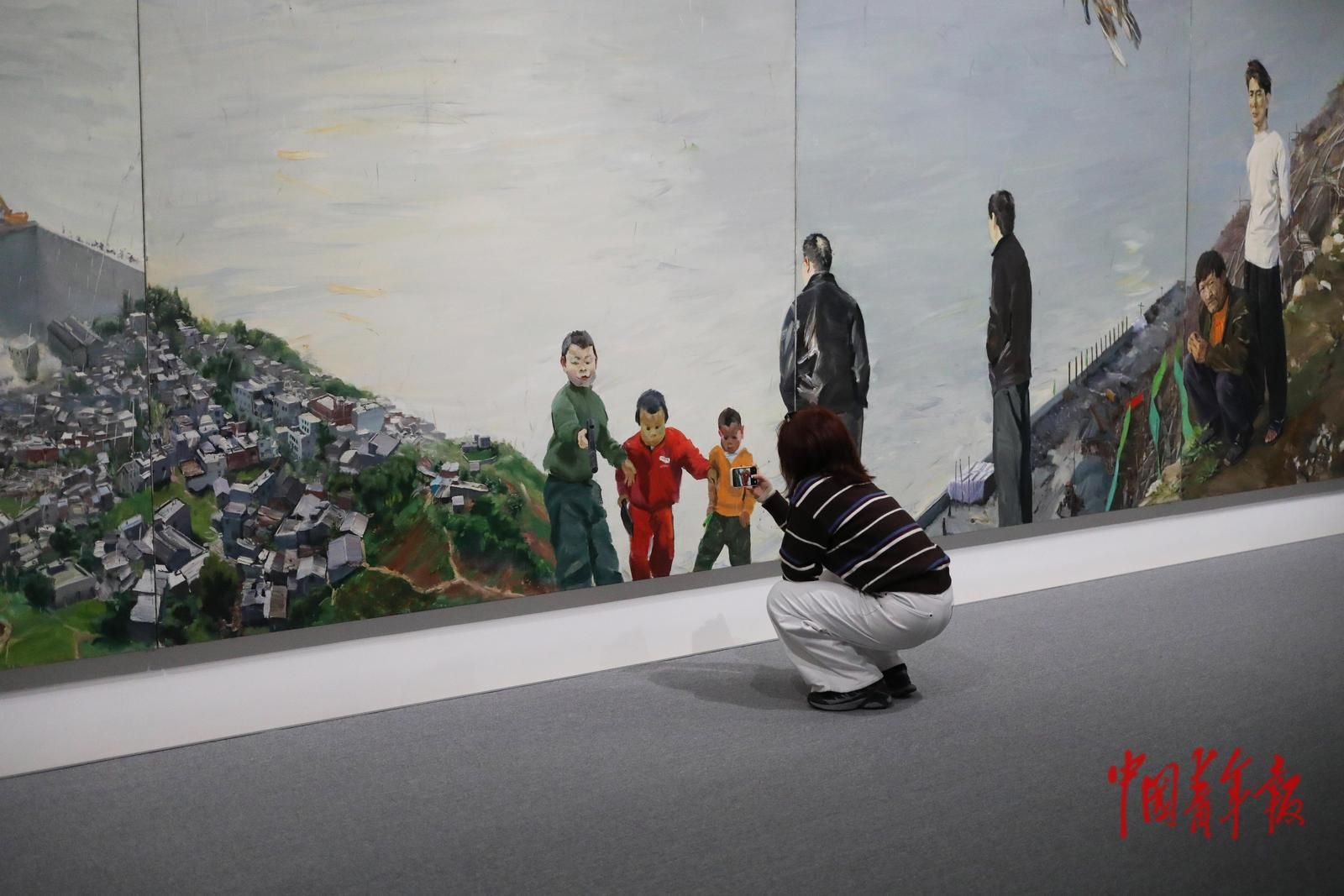 11月23日,北京泰康美术馆,刘小东大型个展“河东,河西”现场,参观者在展厅中拍摄。中青报·中青网记者 孔斯琪/摄