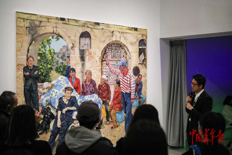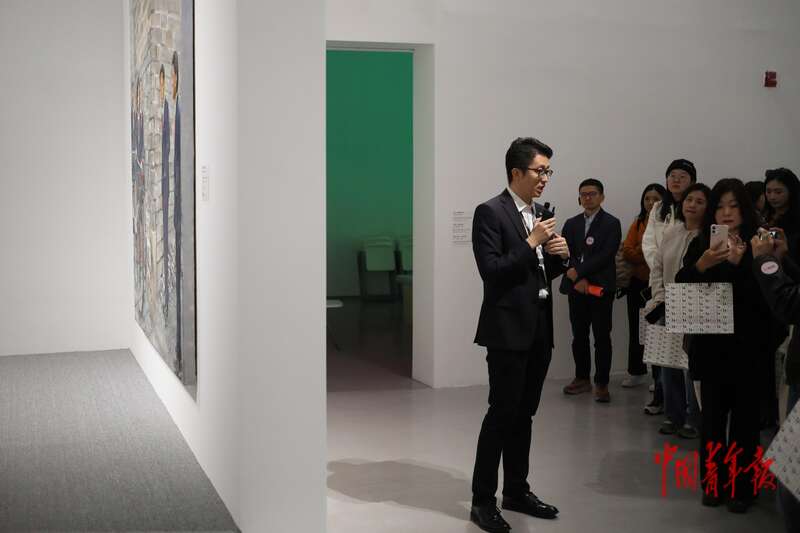 11月23日,北京泰康美术馆,刘小东大型个展“河东,河西”现场, 策展人胡昊在为参观者导览。中青报·中青网记者 孔斯琪/摄