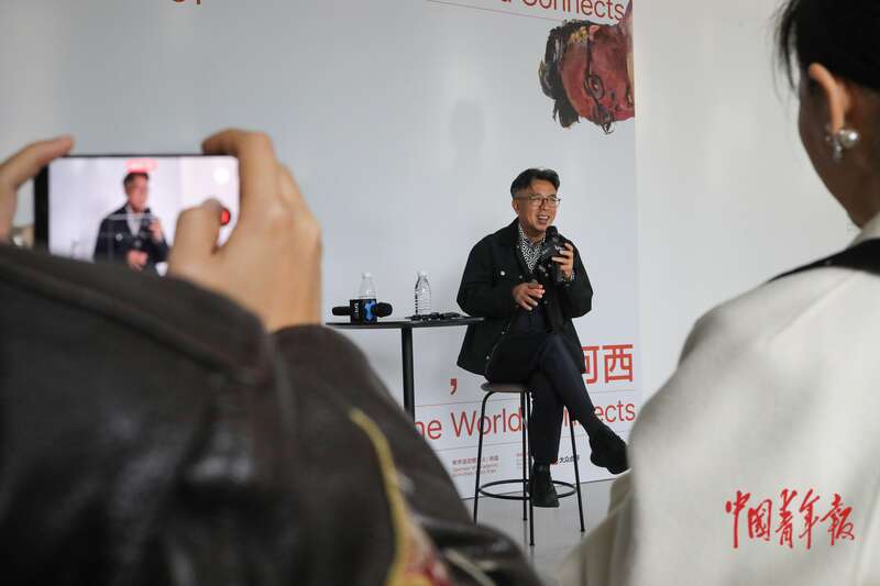 11月23日,北京泰康美术馆,刘小东大型个展“河东,河西”现场,刘小东在接受媒体群访。刘小东1963年出生于辽宁省锦州市,20世纪90年代开始在艺术界崭露头角,被誉为中国新现实主义绘画的开创者。他的作品立足于现实,聚焦时代社会变迁中的普通人面孔。2006年秋,刘小东的作品《三峡新移民》曾以加佣金2200万元的价格打破了当时中国内地当代艺术品的拍卖纪录。中青报·中青网记者 孔斯琪/摄